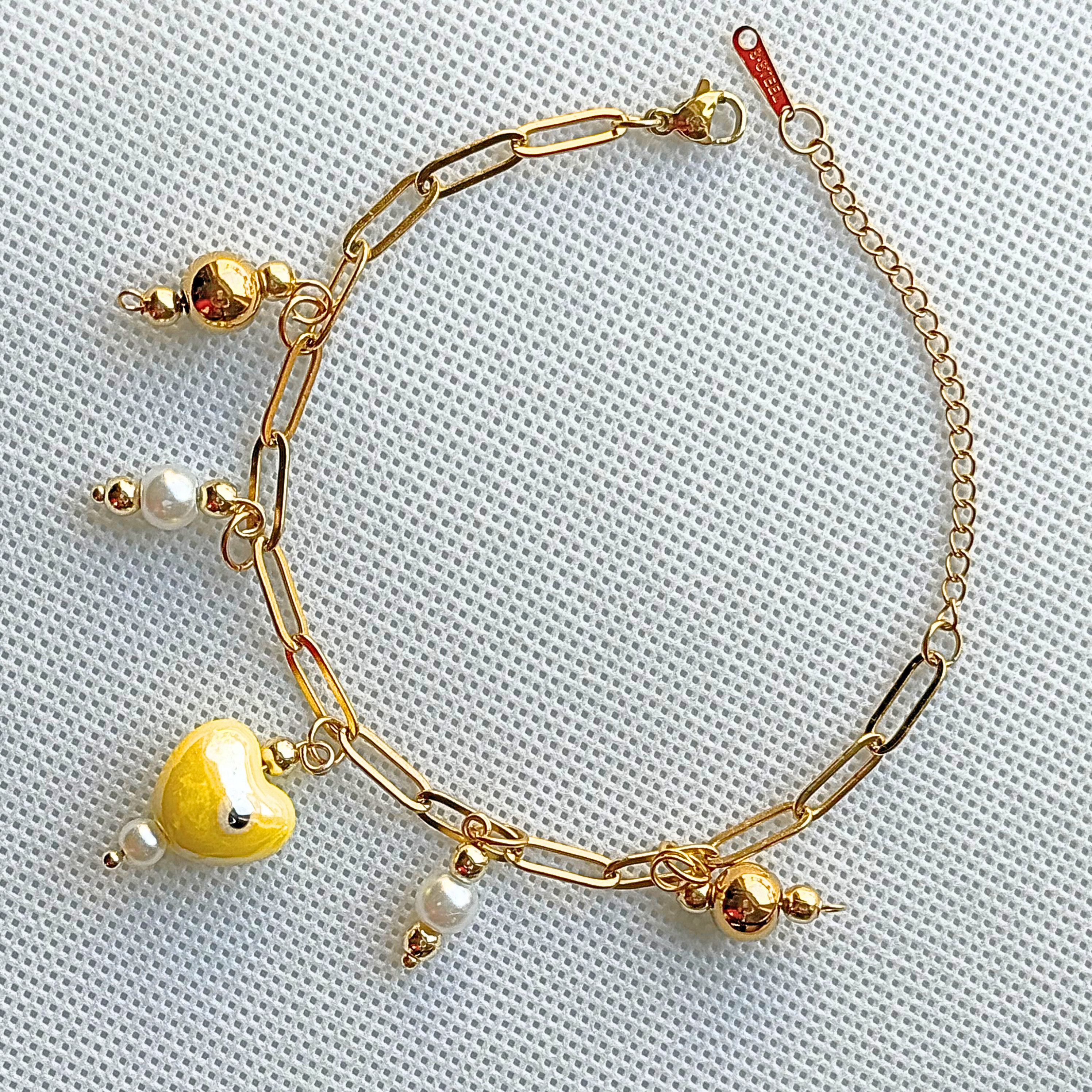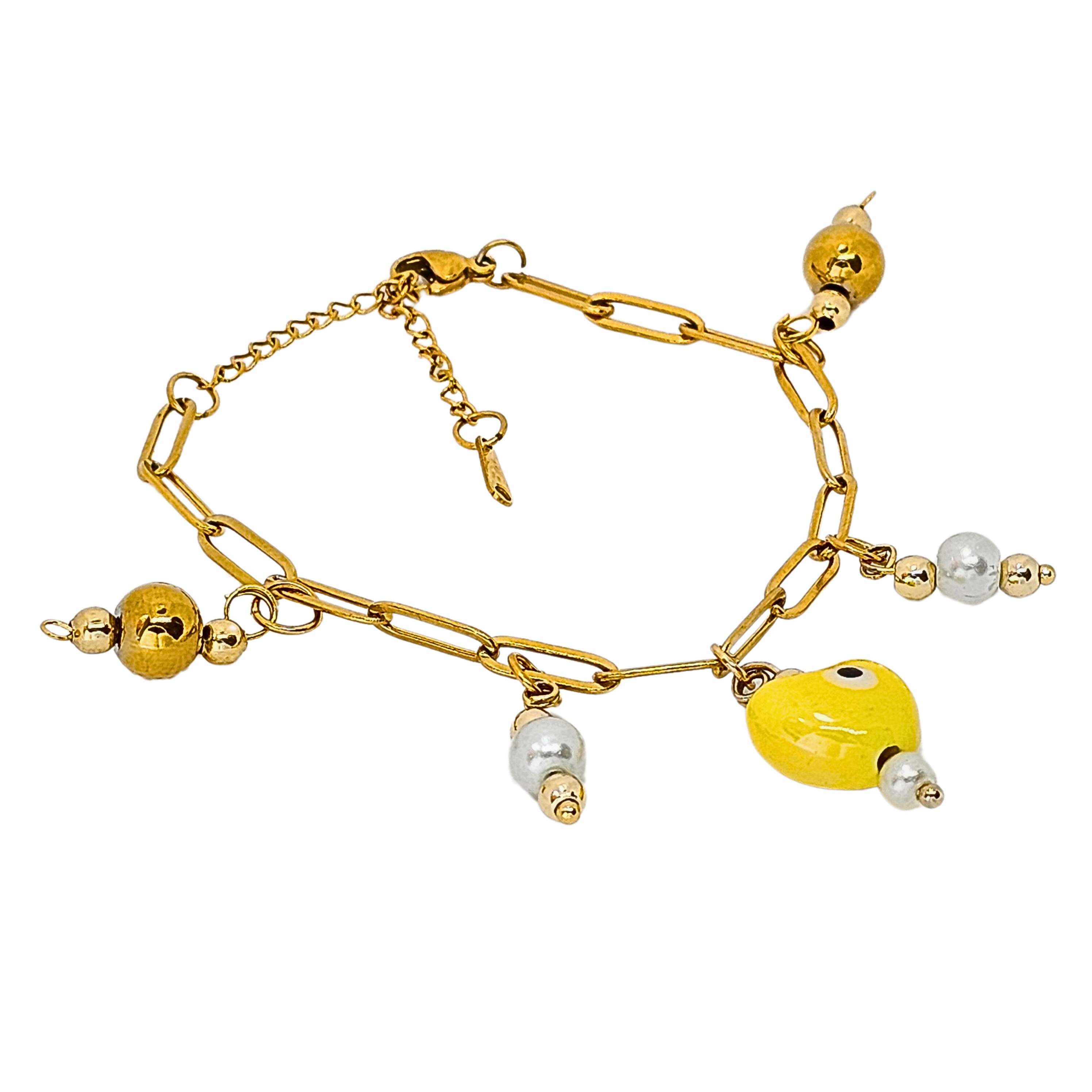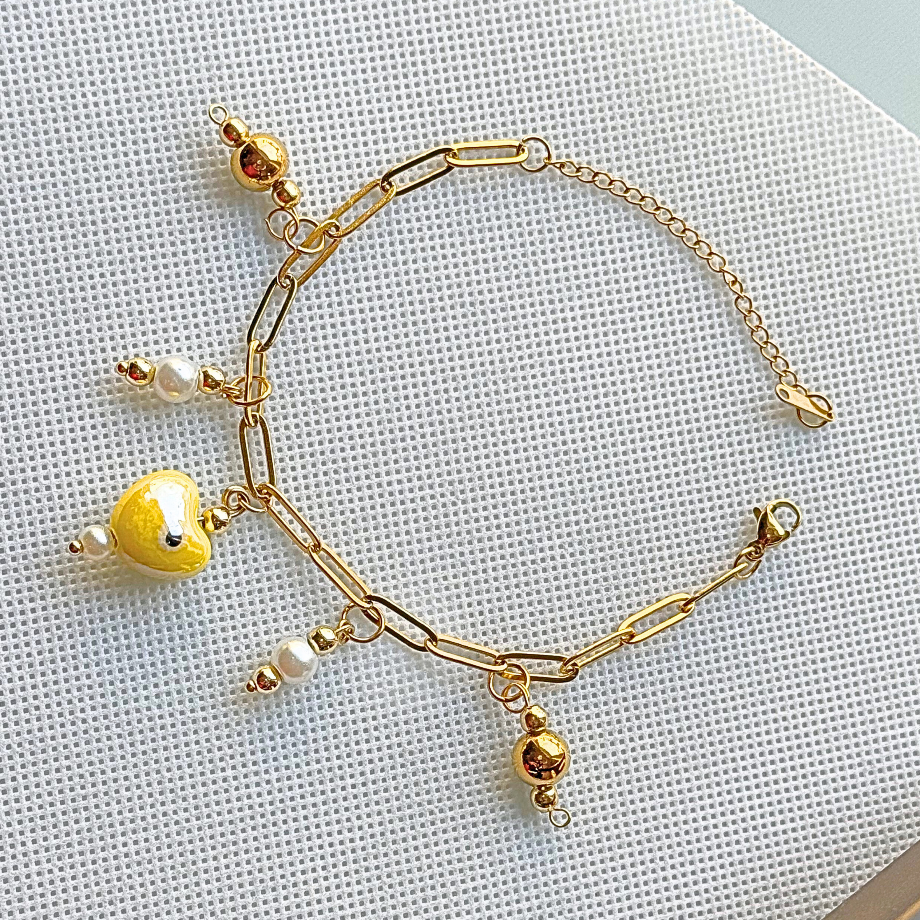 El brazalete Diástole es una joya inspirada en la fase de relajación y expansión del corazón, simbolizando calma, apertura y renovación. Compuesto por una cadena dorada que aporta un toque de elegancia clásica, Diástole incluye delicados dijes de piedras doradas y blancas, evocando armonía y equilibrio. En el centro, un dije en forma de corazón amarillo con un diseño de "ojo" actúa como el núcleo protector de esta pieza, recordándonos la importancia de abrirnos al mundo con confianza y serenidad.