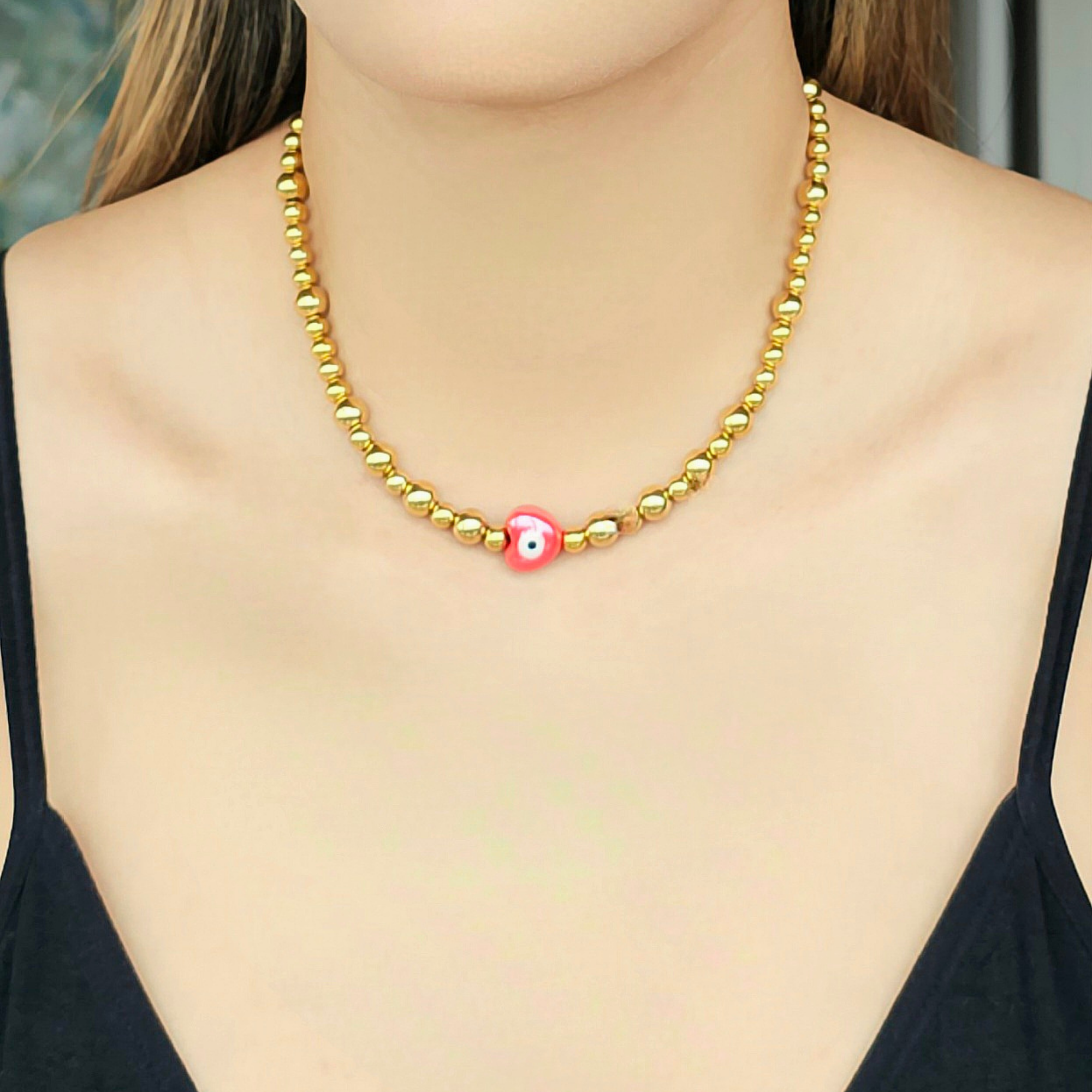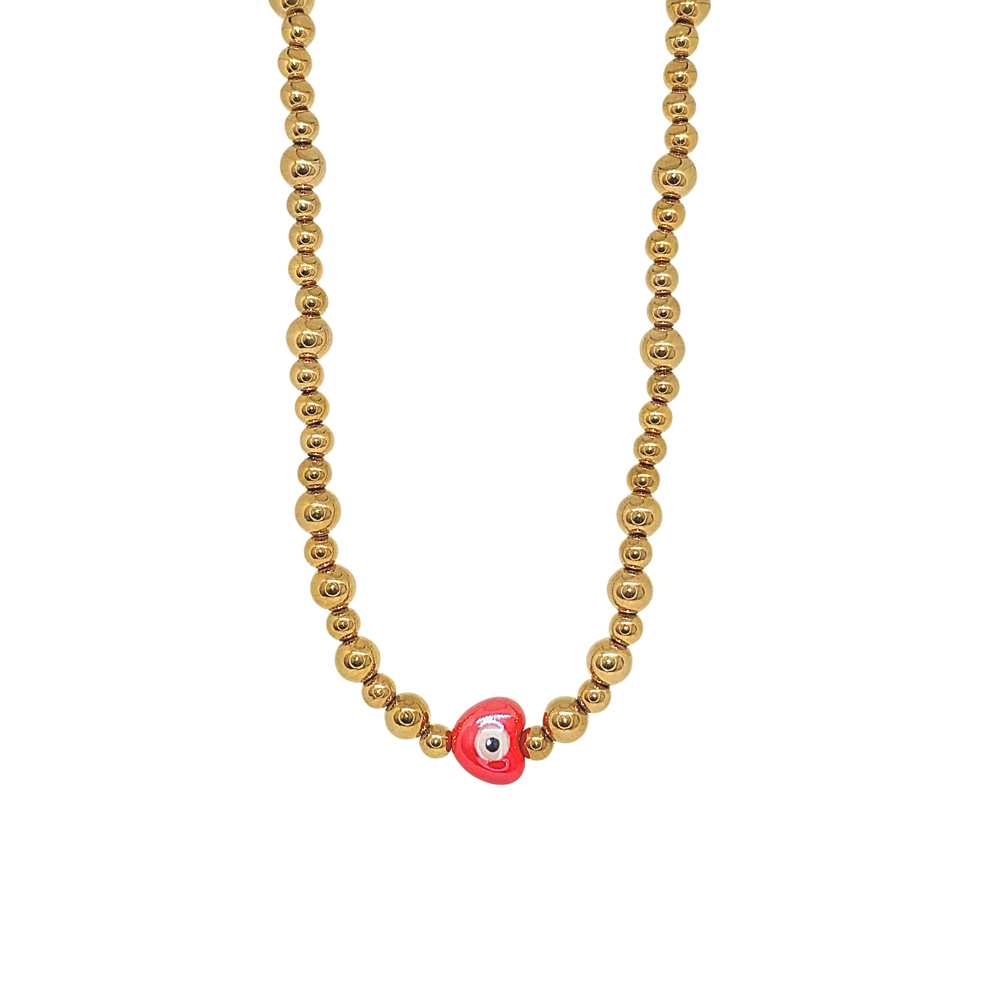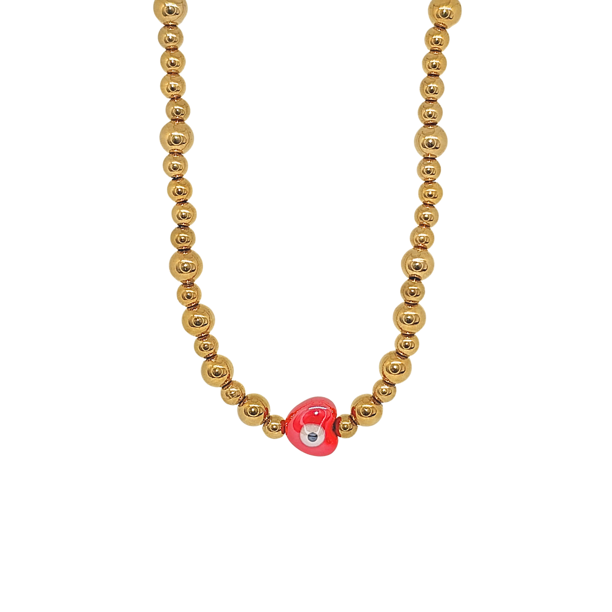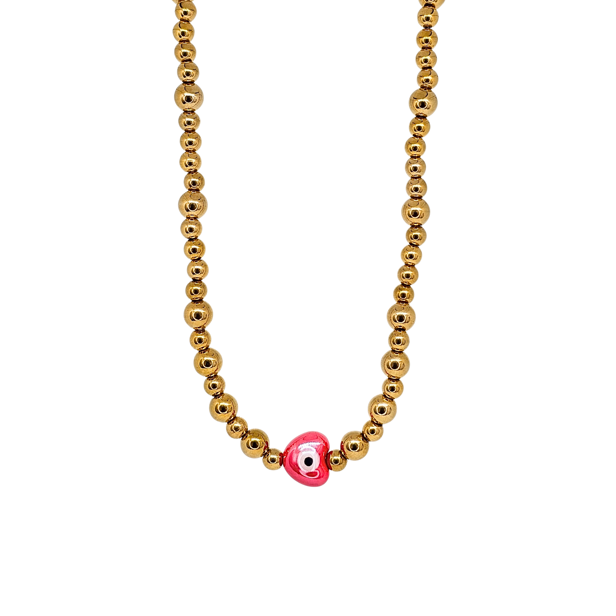 Compuesto de perlas doradas que evocan lujo y energía, este elegante diseño destaca un corazón rojo con un ojo en el centro, simbolizando la fuerza interior, la pasión y la intuición.